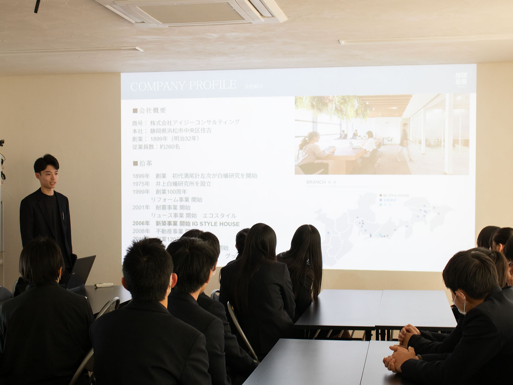今回のフィールドスタディは、アイジースタイルハウス浜松スタジオにて、足立さん、増田さん、大場さん、中澤さんの4名が中心となって企画しました。 まずは、私たちの母体であるアイジーコンサルティングの歩みについてお話ししました。