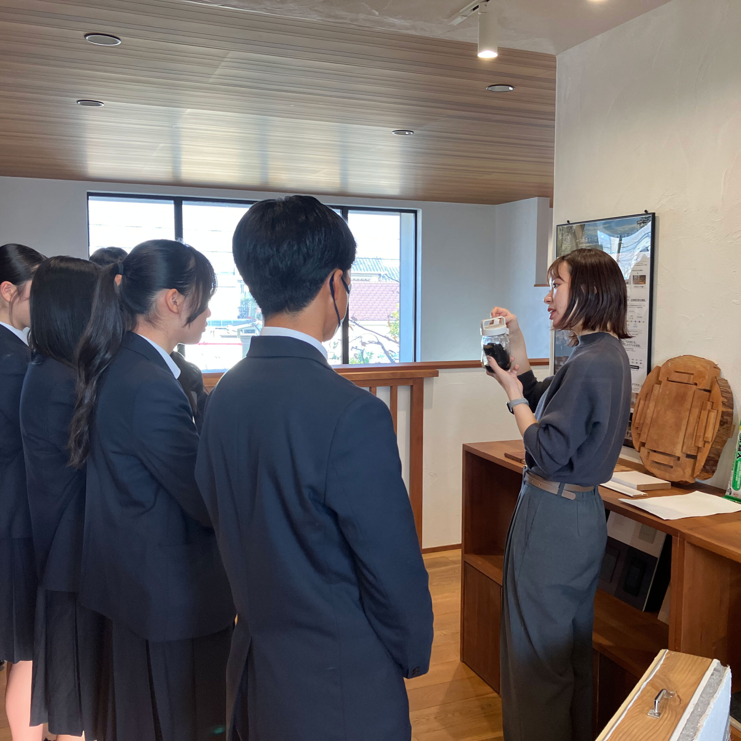 今回の訪問を通して、家づくりに対する思いや、お客様のことを第一に考えて仕事をされていることがよく伝わってきました。特に、自然素材を使った家づくりや、住む人の健康や暮らしを大切にしている点がとても印象に残りました。また、実際の仕事の内容や、働くことのやりがいについて教えていただき、将来の進路について考える良いきっかけになりました!
